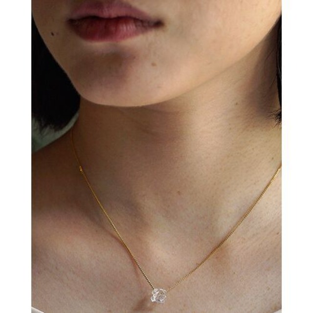 ハーキマーダイヤモンドは、その独特の透明感と自然な輝きが魅力の天然石。このネックレスでは、控えめながらもその輝きを楽しめるシンプルで上品なデザインに仕上げました。日常のどんなシーンにも馴染みやすく、飽きのこない一品。天然石のため、ひとつひとつ異なる形やサイズが特別感を添えています。 【ブランド】temtem 【素材】14kgf、ハーキマーダイヤモンド 【サイズ】約38.5cm 【原産国】日本 ※お手入れ方法:着用後は柔らかい布でやさしく汗や皮脂を拭き取ってください。 ※保管方法:お手入れ後はチャック付きの袋などに入れて、空気を遮断して保管すると変色防止になります。 【temtem】 always on your side. なにげない毎日の中で、ふとちょっとだけ迷ったとき。なんだか緊張するとき。ほんの少しだけ、勇気が欲しいとき。なんとなく、ひと休みしたくなったとき。指先に触れる、その小さな輝きはやわらかに私の背中を押してくれる。美しい花をやさしく包むかすみ草のようにそっと肌に寄り添う小さなアクセサリー、『temtem』。日常のひとときに、“かわいい”ときめきをお届けします。