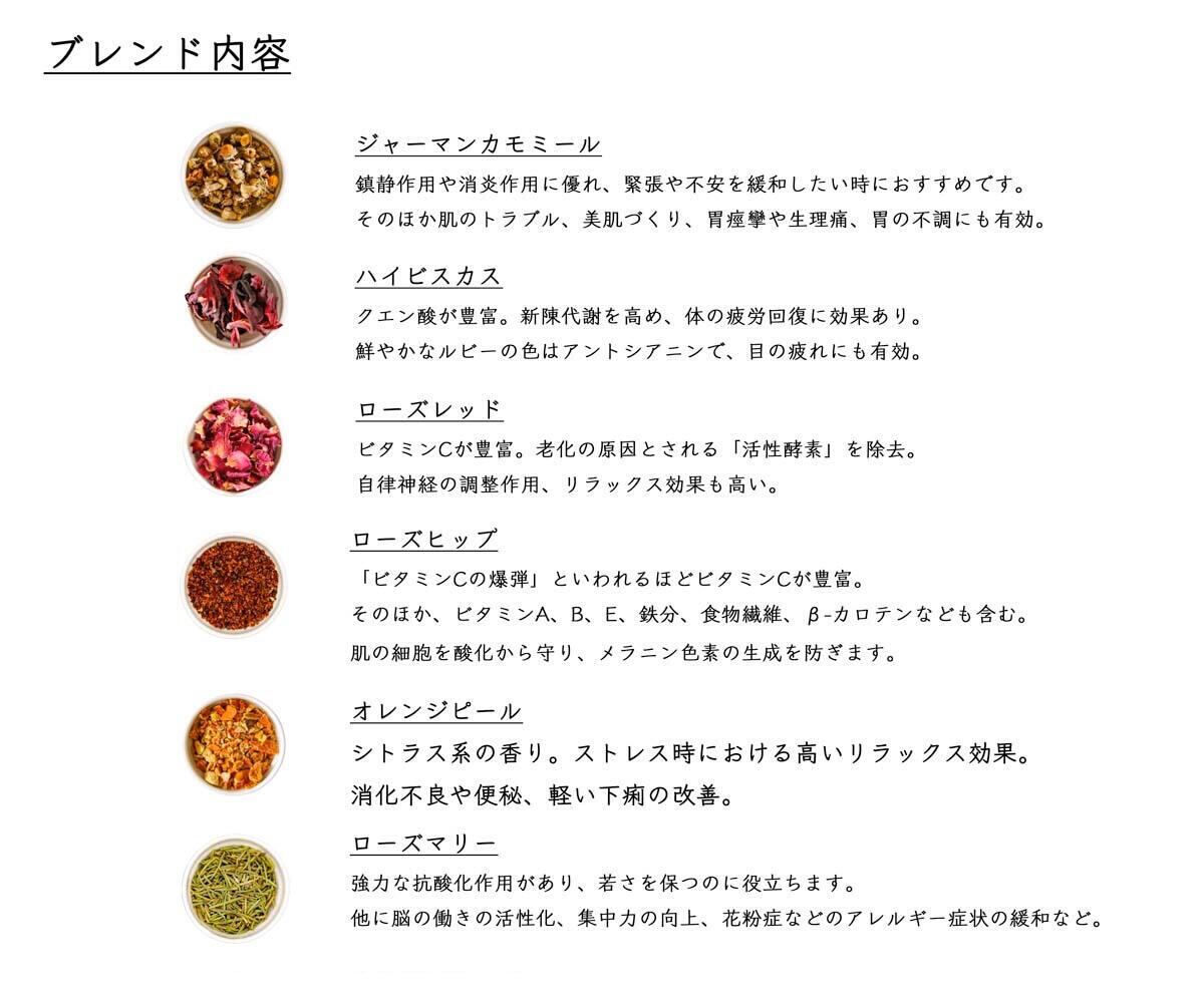 クエン酸が豊富なハイビスカス、鎮静効果のあるカモミール、ビタミンCたっぷりのローズヒップが、豊富で肌や疲れた心身をサポート。