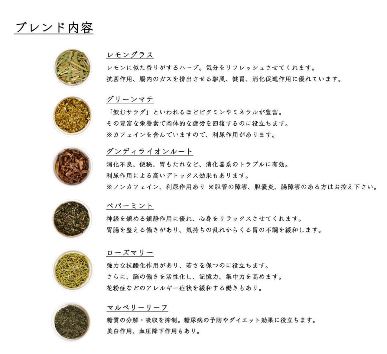 消化を促すダンディライオンルートのほか、抗酸化作用に優れたグリーンルイボス、ビタミンCたっぷりのローズヒップもふんだんにブレンド。